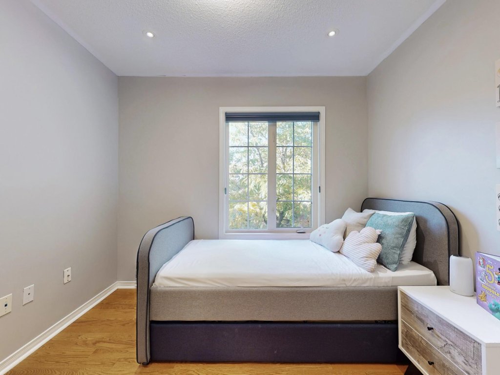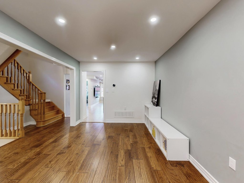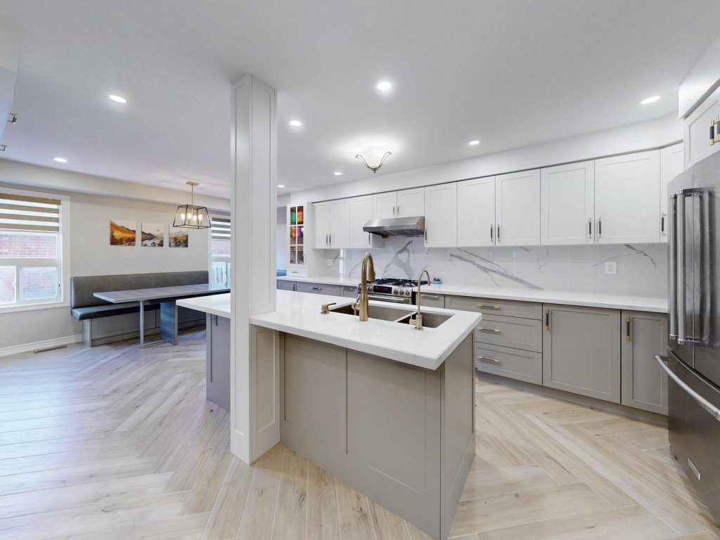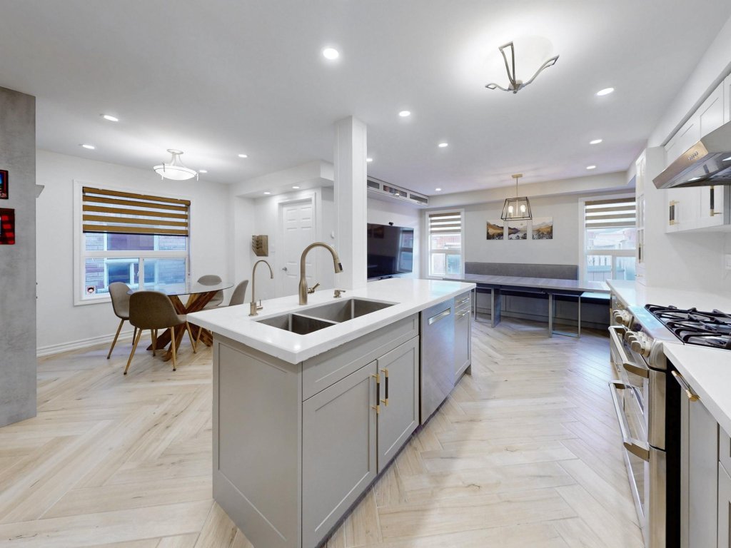 Stylish and smartly upgraded end-unit townhome in prime Markham near Hwy 7 & McCowan. Steps to Main Street Unionville, top schools, parks, restaurants, and shops. Features engineered hardwood and herringbone accent tile, quartz kitchen with full-height pantry, built-in banquette, LED lighting, and smart switches. Primary ensuite with frameless glass shower, rainfall head, and double vanity. Finished basement includes a cozy reading nook and home theatre with built-in speakers and motorized projector screen. Front yard with auto irrigation and custom stone steps; backyard fully interlocked with dual fence access. Detached double garage with concrete driveway. A rare blend of modern comfort, function, and location! Download a copy of the Feature Highlight!